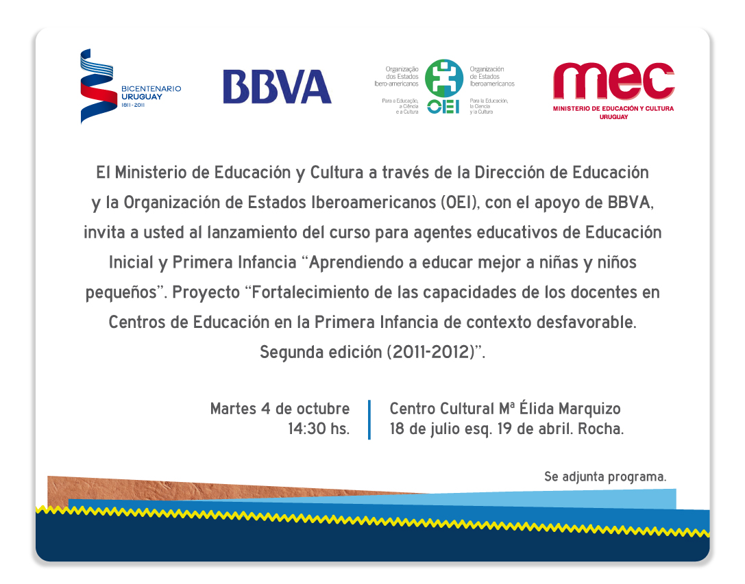 La Dirección de Educación del MEC y la Organización de Estados Iberoamericanos, con el apoyo del banco BBVA, realizarán el lanzamiento del curso de formación de agentes educativos de educación inicial y primera infancia "Aprendiendo a educar mejor a niñas y niños pequeños”, proyecto “Fortalecimiento de las capacidades de los docentes de centros de educación en la primera infancia de contextos desfavorables. Segunda edición (2011-2012)".