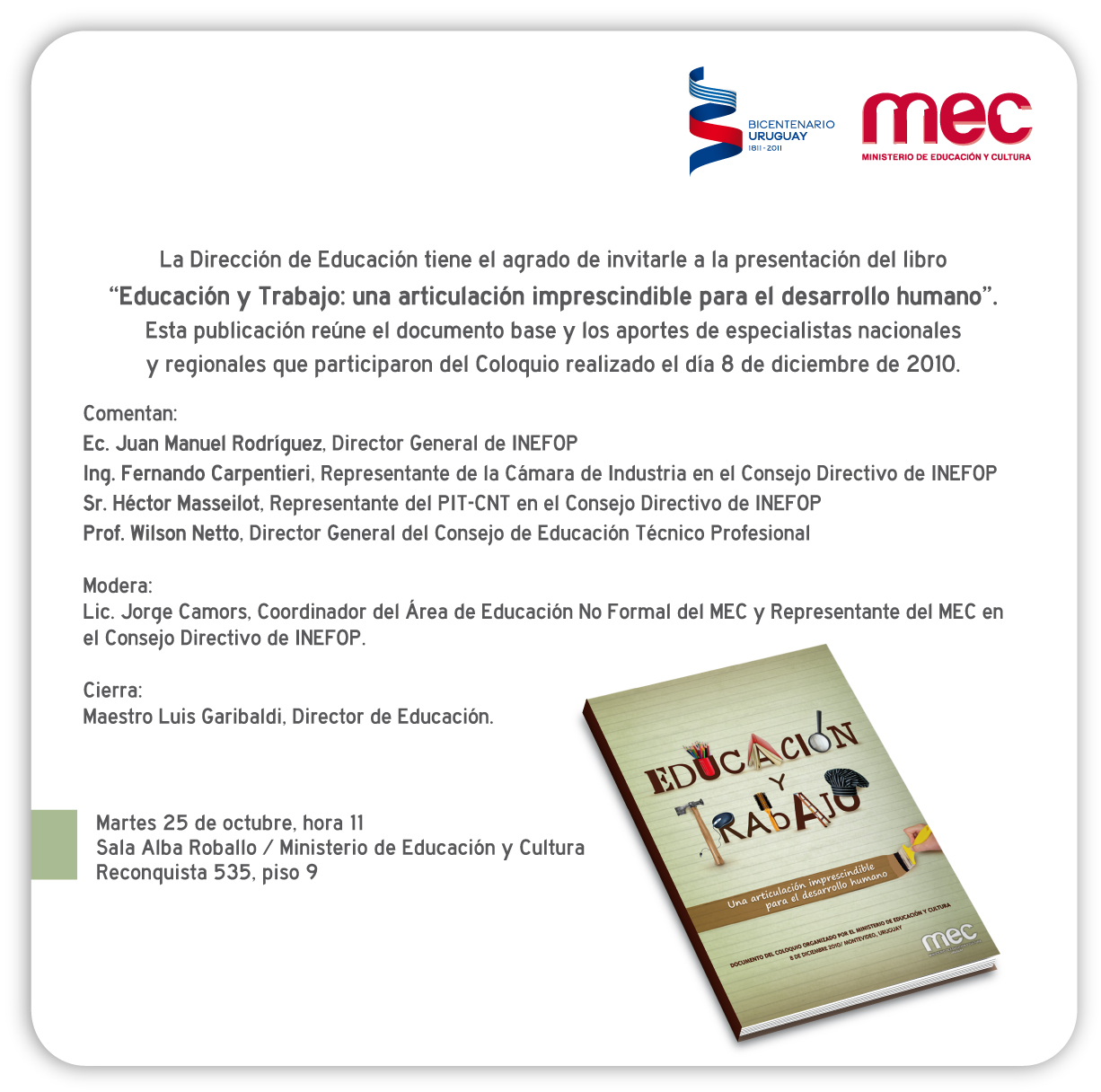 La Dirección de Educación tiene el agrado de invitarle a la presentación del libro "Educación y trabajo: una articulación imprescindible para el Desarrollo humano".