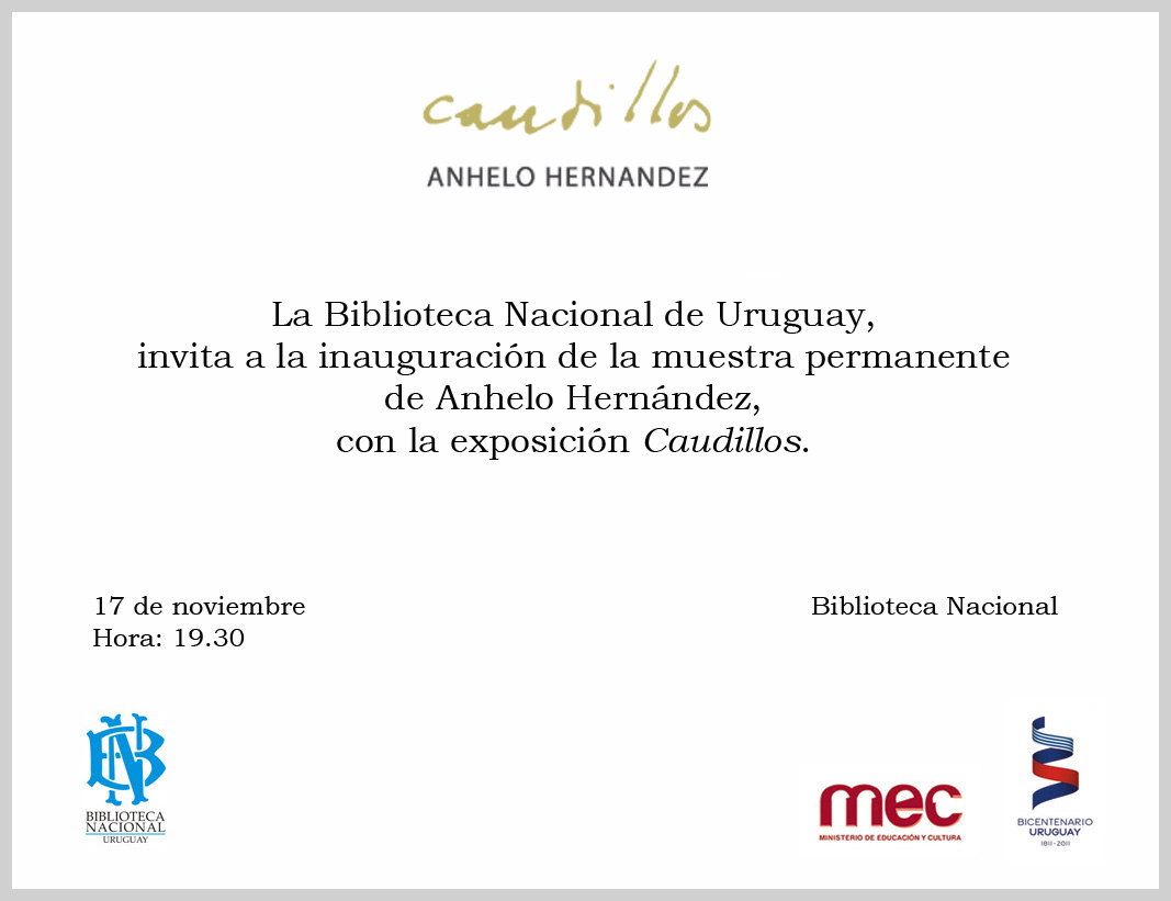 La Biblioteca Nacional (BibNa) invita a la inauguración de la muestra permanente de Anhelo Hernández, con la exposición "Caudillos".La apertura al público se realizará el jueves 17 de noviembre, a la hora 19.30, en la BibNa - 18 de Julio 1930-.