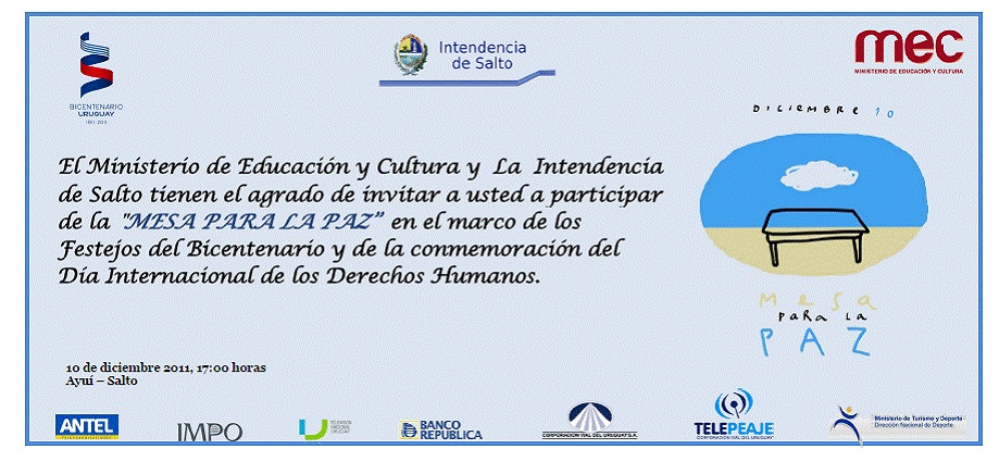 El Ministerio de Educación y Cultura (MEC), a través de la Dirección Nacional de Derechos Humanos y la Intendencia de Salto, invitan a participar de la Mesa para la Paz 2011, el próximo sábado 10 de diciembre, desde la hora 17, en Ayuí-Salto, en el marco de los festejos del Bicentenario y de la conmemoración del Día Internacional de los Derechos Humanos.
