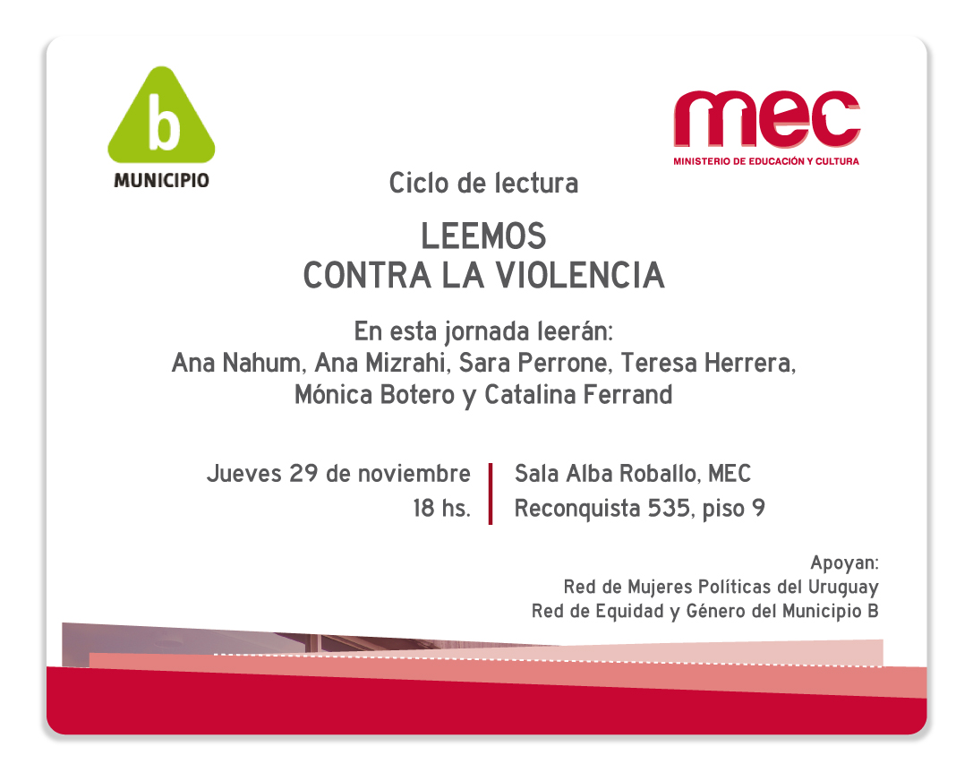 El jueves 29 de noviembre continuará el ciclo de charlas "Leemos contra la violencia", organizado por el Ministerio de Educación y Cultura (MEC) y el Municipio B de Montevideo.
