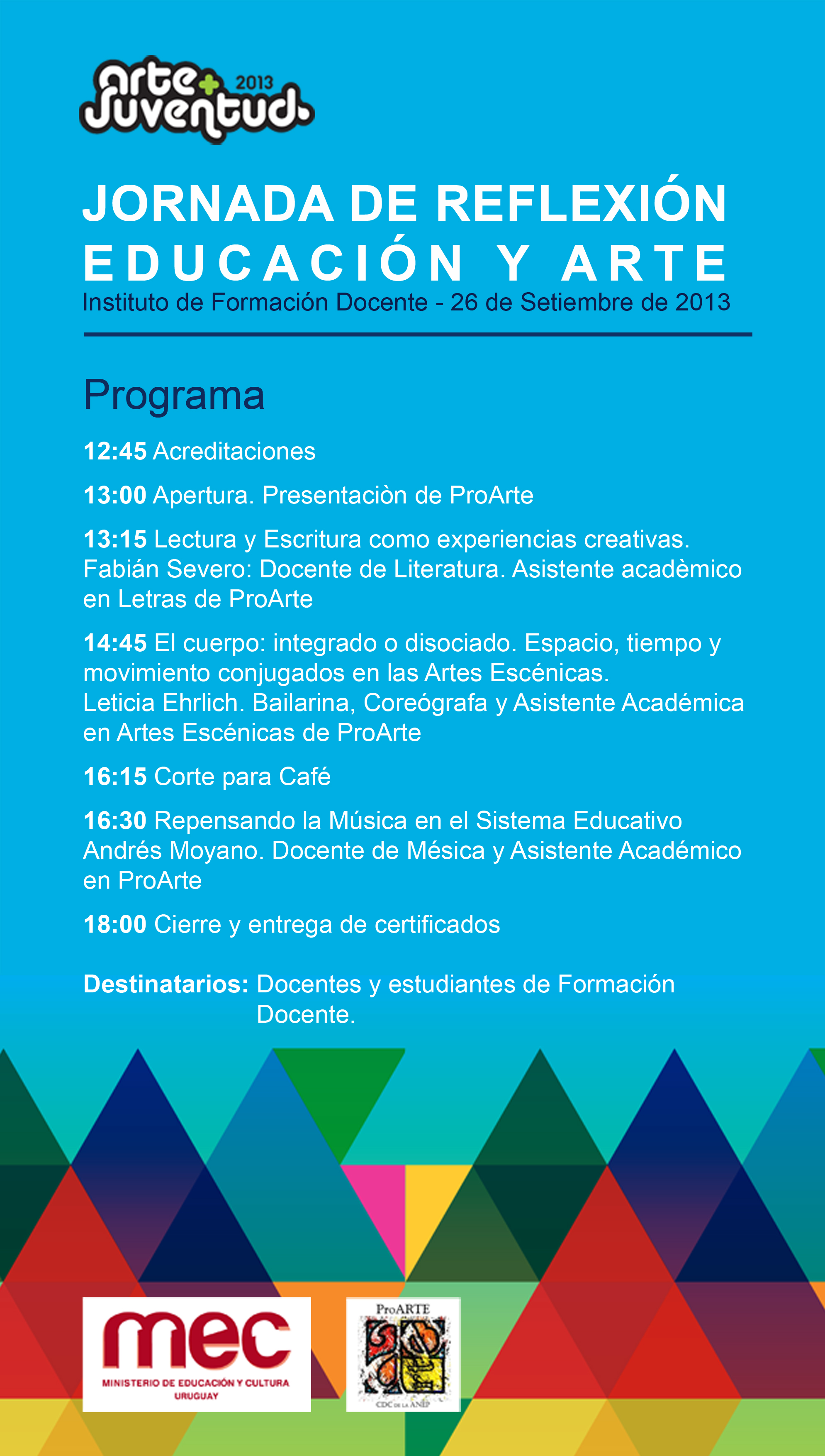 El próximo jueves 26 de setiembre en el marco del Encuentro de Arte y Juventud 2013 se realizará en el Instituto de Formación Docente de Mercedes la Jornada de reflexión Educación y arte.