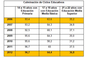 10. Los datos administrativos que se presentaron, confirman los divulgados meses atrás por el MEC analizando los datos de la Encuesta Continua de Hogares 2012. Se confirma la tendencia positiva en la culminación de ciclos educativos que se había manifestado en 2011.