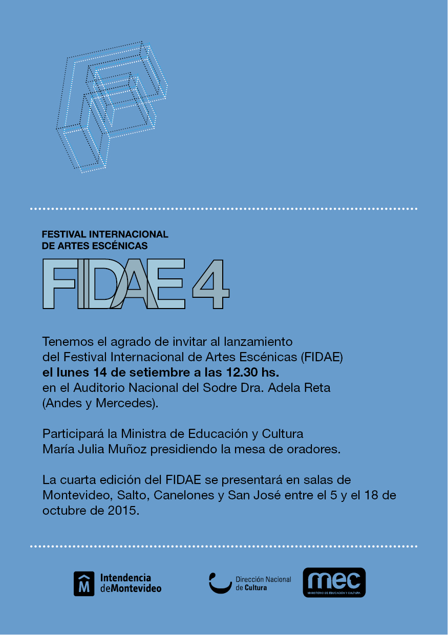 Tenemos el agrado de invitar al lanzamiento del Festival Internacional de Artes Escénicas (FIDAE) el lunes 14 de setiembre a las 12.30 hs. en el Auditorio Nacional del Sodre Dra. Adela Reta (Andes y Mercedes).